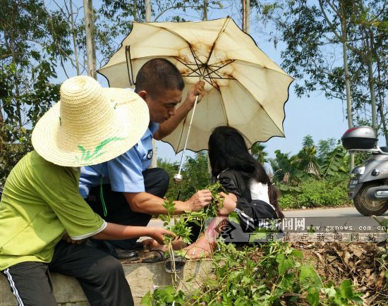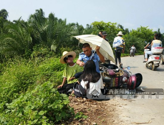 广西新闻网贺州9月16日讯(通讯员 甘勇)9月14日,贺州市平桂区羊头镇垒田村路段发生一起电动摩托车与皮卡车相撞交通事故,事故导致2名女青年手脚骨折,其中一名伤势较重,左小腿被骨折断裂的骨头刺穿皮肉流血不止,侧倒在路面上。为保护伤者,现场民警找来路边有止血功效的药草为其包扎止血,而后又一边安抚伤者情绪一边为伤者遮阳近40分钟,直到救护人员赶到现场。
