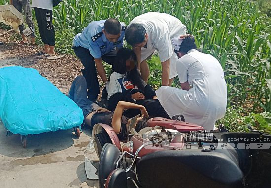 9月14日10时30分,贺州市公安局羊头派出所民警王思睦、辅警黄旺流正在辖区执行中秋期间巡防勤务,其间发现羊头镇垒田村路段发生一起电动摩托车与皮卡车相撞交通事故,2名女青年因受撞力手脚骨折,其中一名伤势较重,左小腿被断裂的骨头刺穿皮肉流血不止,侧倒在路面上。随后,两人分工对2名伤者进行救助。